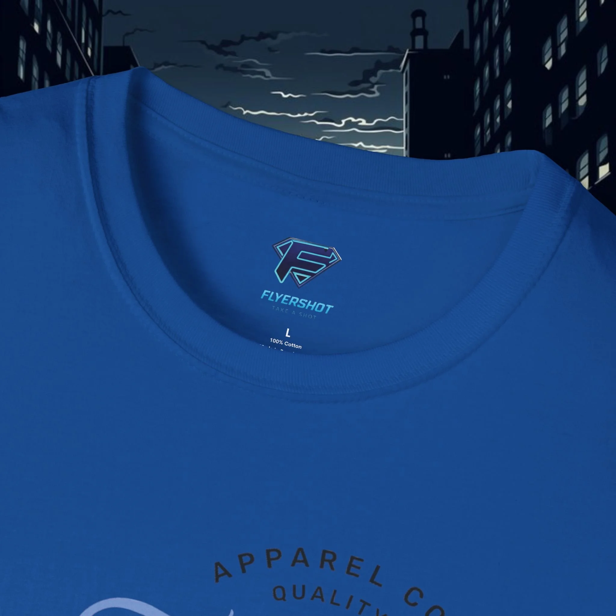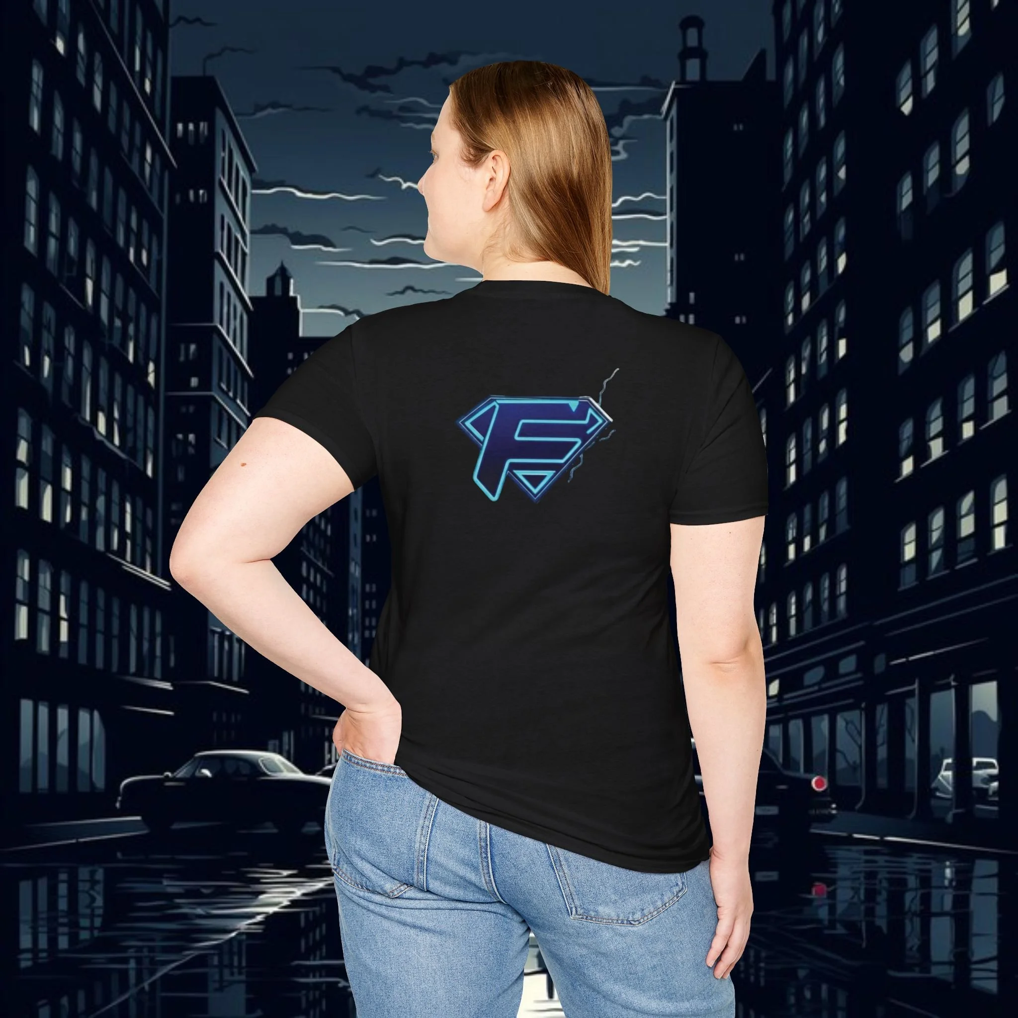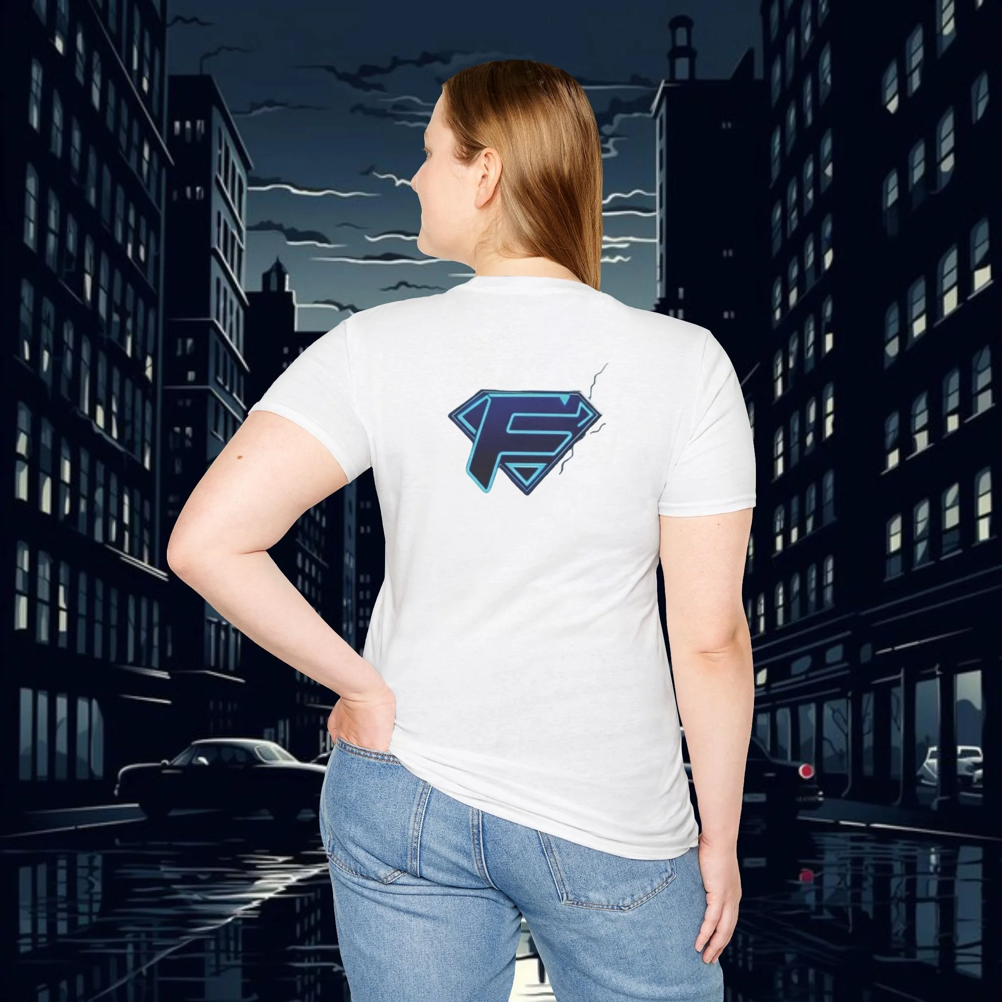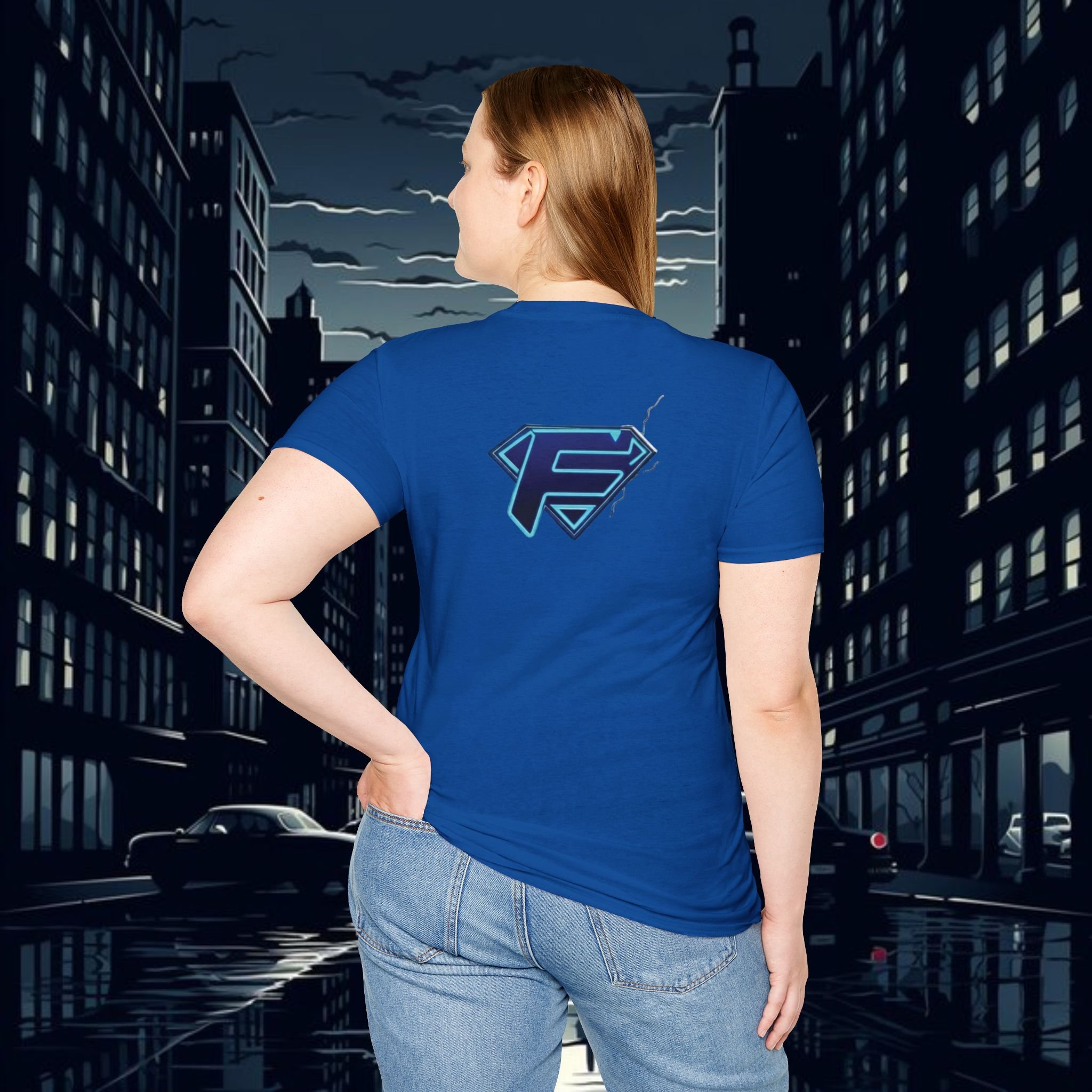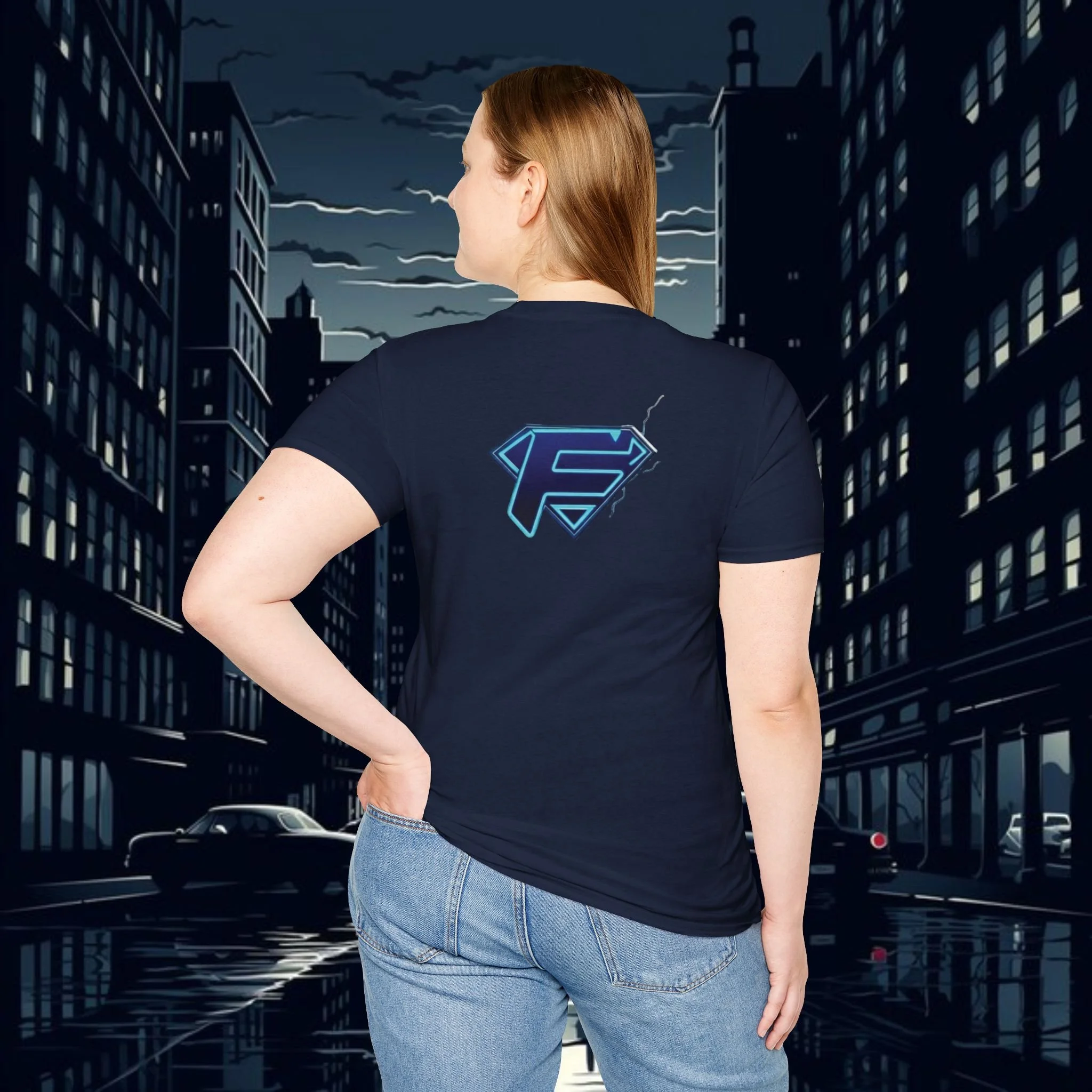 A lightweight, vintage-inspired tee for someone who likes action, style, and subtle nostalgia. The front shows a bold cinematic figure in a dynamic stance, with flowing script above that evokes an old-school surf or film logo. The back carries a crisp emblem — a stylized 'F' shaped like a superhero crest — giving the shirt a playful, urban edge. Wear it layered under a denim jacket or solo with joggers; it reads like a favorite poster you can put on your body. The breathable ring-spun cotton feels soft against skin and holds print detail sharply, so the art looks lived-in but still vivid after many wears. This shirt works when you want to channel a confident, slightly retro action vibe — whether you're headed to a late-night screening, a casual meetup with friends, or just wandering the city streets looking for a new story.