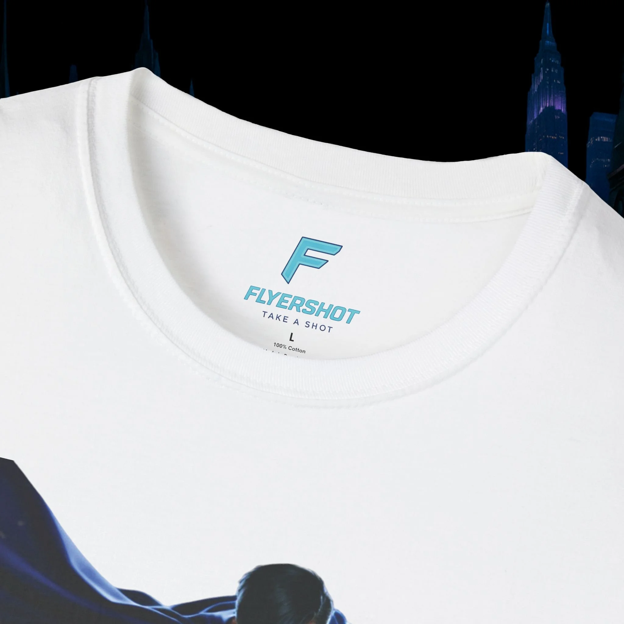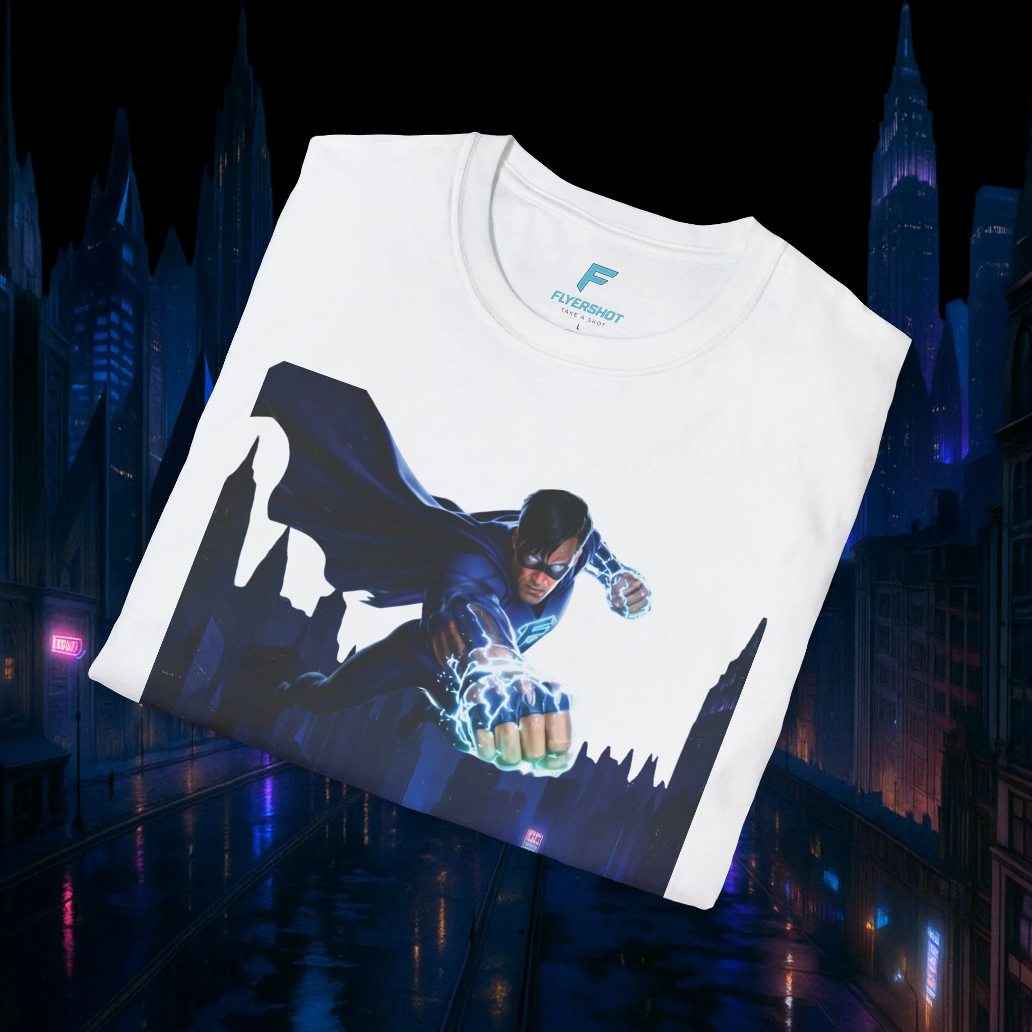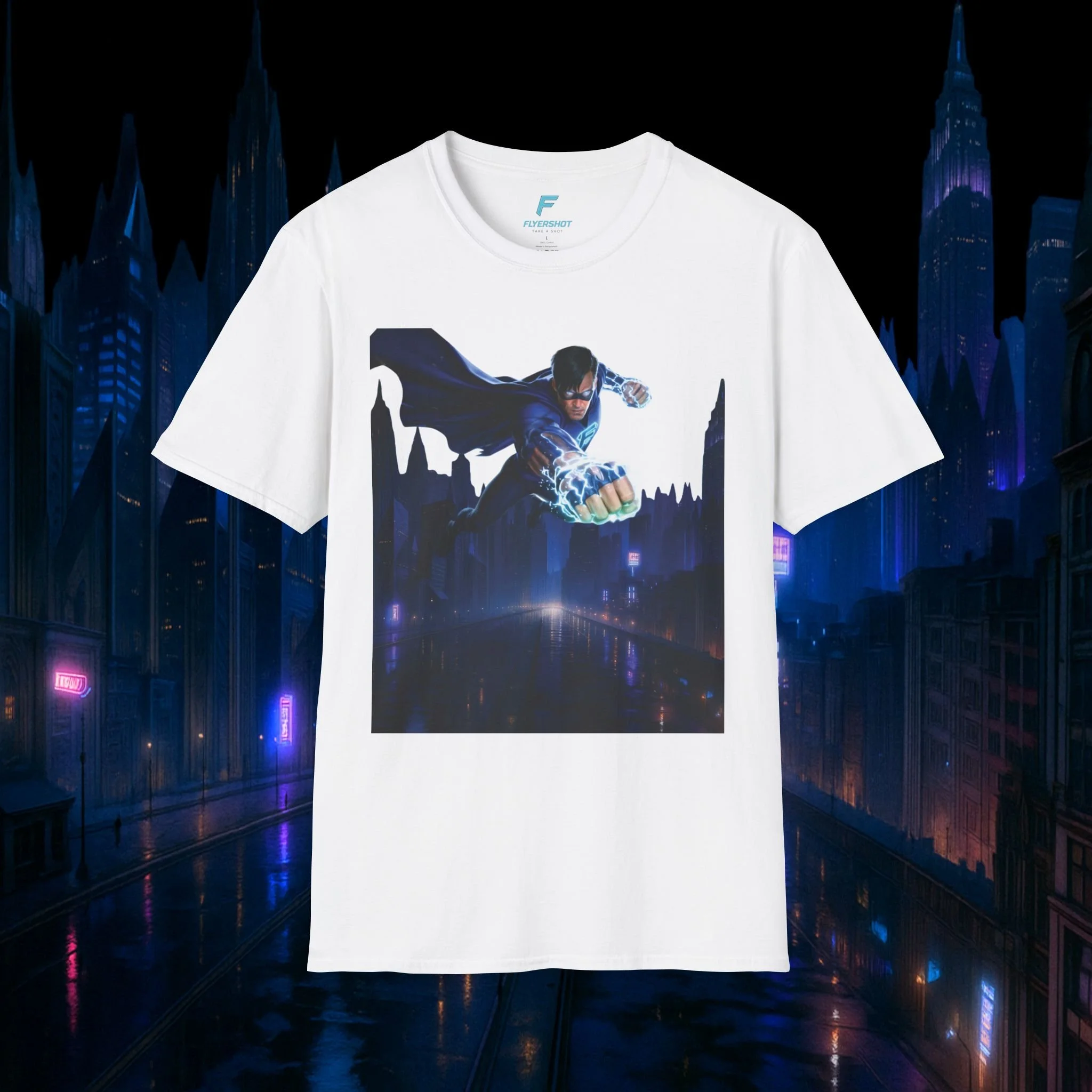 Flyershot Superhero Night Flight T-Shirt – Futuristic Hero Graphic Tee