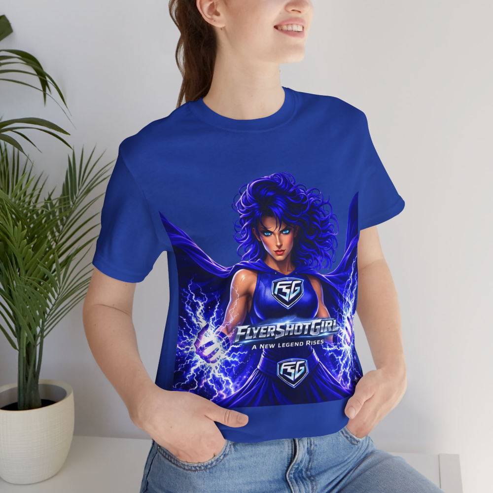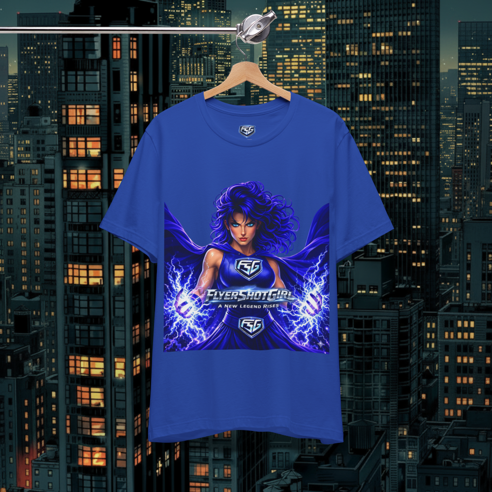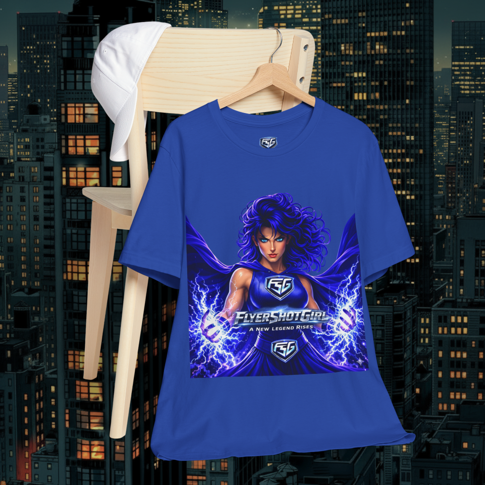 FlyershotGirl® Lightning Power Tee – “A New Legend Rises” Electric Superhero Shirt